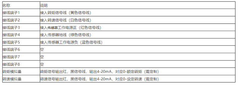 傳感器與測量儀接線: 設備前后板設有 8 個接線端子,各端子功能、接線要求及信號輸出規格如下表所示: