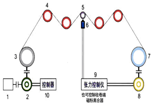 1-電機 6-張力檢測傳感器 2-磁粉離合器 7-放卷芯 3-收卷芯 8-磁粉制動器 4-傳動輪 9- ZK-1型自動張力控制儀 5-張力檢測輥 10-控制器