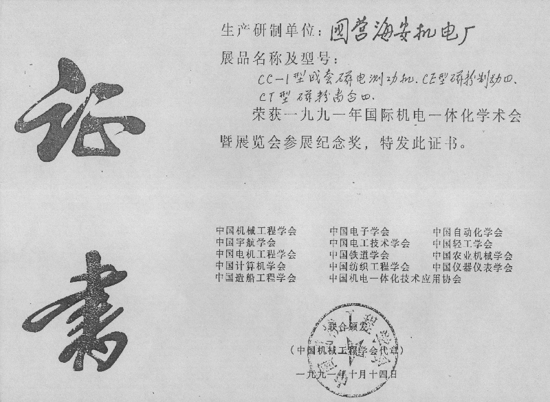榮獲一九九一年國際機電一體化學術會暨展覽會參展紀念獎,特發此證書。