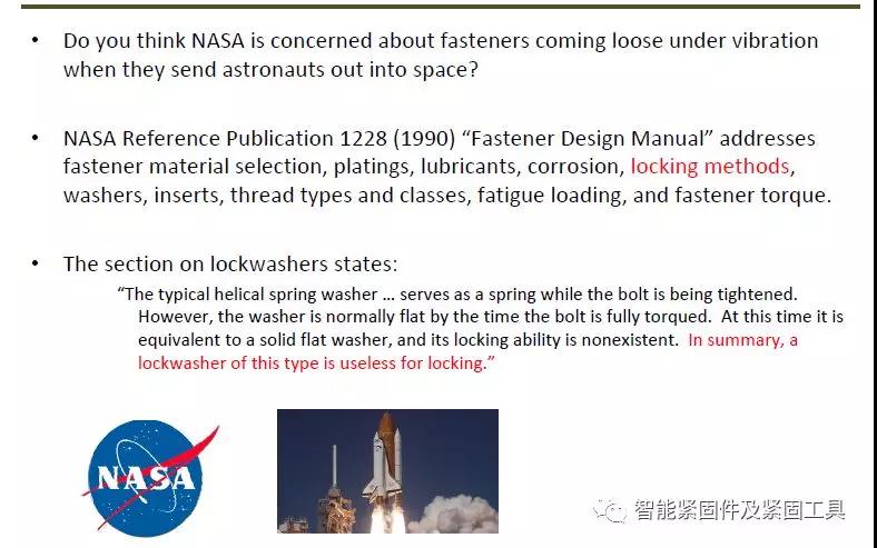 車橋主減速器與橋殼的連接使用10.9級M16X100螺栓,擰緊力矩為280+20 N·m,使用高精度電動擰緊機擰緊。在有彈簧墊圈和沒有彈簧墊圈兩種狀態下檢測螺栓擰緊過程中力矩隨轉角的變化。對比力矩轉角曲線,發現在有彈簧墊圈的情況下,一直有約10 N·m的預緊力矩;而沒有彈簧墊圈的情況下,螺栓在力矩顯著上升前,力矩處于0 N·m狀態。 以此推斷用約10 N·m的螺栓預緊力矩就可以將彈簧墊圈完全壓平。再通過用數顯扭矩扳手檢測,發現螺栓扭矩還未達到20 N·m,彈簧墊圈已經完全被壓平,驗證了上述推斷的正確性。 分析以上兩點說明,彈簧墊圈只能提供10 N·m的彈力,而10 N·m的彈力對于280 N·m的螺栓預緊力矩來說可以忽略,其次,這么小的力,不足以使彈簧墊圈切口處的尖角嵌入螺栓和被連接件表面。折卸后觀察,螺栓和被連接件表面都沒有明顯的嵌痕。所以,彈簧墊圈對螺栓的防松作用可以忽略。 另外,在螺栓與被連接件之間增加一個墊圈,如果墊圈質量有問題,相當于給螺栓連接又增加了一個安全隱患。 綜上所述,當螺栓扭矩較大時(大于200 N·m),用彈簧墊圈給螺栓防松的方式弊大于利。為此,在沖擊、振動和變載的作用下,預緊力可能在某一瞬間消失,連接有可能松脫。 同時,美國宇航局(NASA)也發現了開口彈簧墊圈的問題,在NASA標準中在鎖緊螺母一章中,這樣寫到:“典型的螺旋彈簧墊圈…在螺栓緊固的時候起到彈簧的作用。可是,當螺栓被完全緊固的時候,墊圈一般來講是變平了。在這個時候,完全可以將它當作一體平墊圈,它的鎖緊功能根本不存在。總而言之,這種類型的鎖緊墊圈對于鎖緊而言,一無是處。”原文節選,參見下圖。