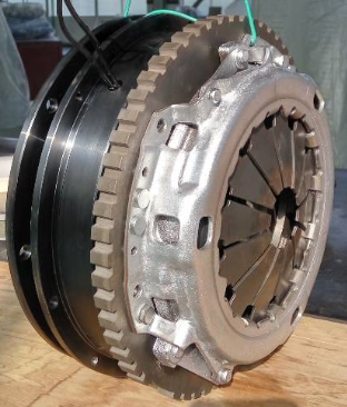 該產品可取代原來的干式離合器,安裝在發動機與變速箱章。由原來的人為腳踩離合器改為行車電腦控制下的電流控制離合器。在小型轎車試車已獲成功。該磁粉離合器最高轉速6000rpm,額定轉矩100Nm。是當年比較經濟自動檔方案。 2017年,研制開發和雙離合器總成。將磁粉離合器與干式離合器組合成雙離合。1、3、5檔采用干式離合器,2、4、6檔采用磁粉離合器。當奇數檔換偶數檔時磁粉離合器預先結合(磁粉離合器可打滑工作)然后再松開奇數檔的干式離合器。此方案下汽車在自動換檔過程中無沖擊,無頓挫,駕駛舒適度高。